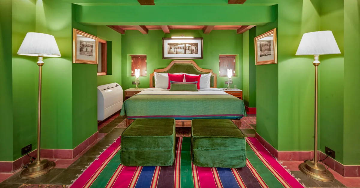 At the top of the building, the Sunset Terrace offers panoramic views of the surrounding village, while rooms are furnished with antique pieces and custom-made light fixtures. The colour palette of greens, browns and reds is drawn from the traditional Athangudi tiles crafted in this area for centuries.
