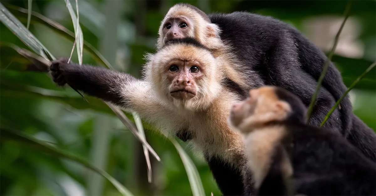 In the beachside Cahuita National Park, lush rainforest meets the Caribbean Sea. Here, troops of capuchin monkeys leap from tree to tree.