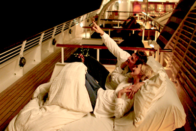 A fully-rigged tall ship with billowing white canvas cuts through the ocean as the happy couple laze in the sun, listening to the sounds of the waves below.