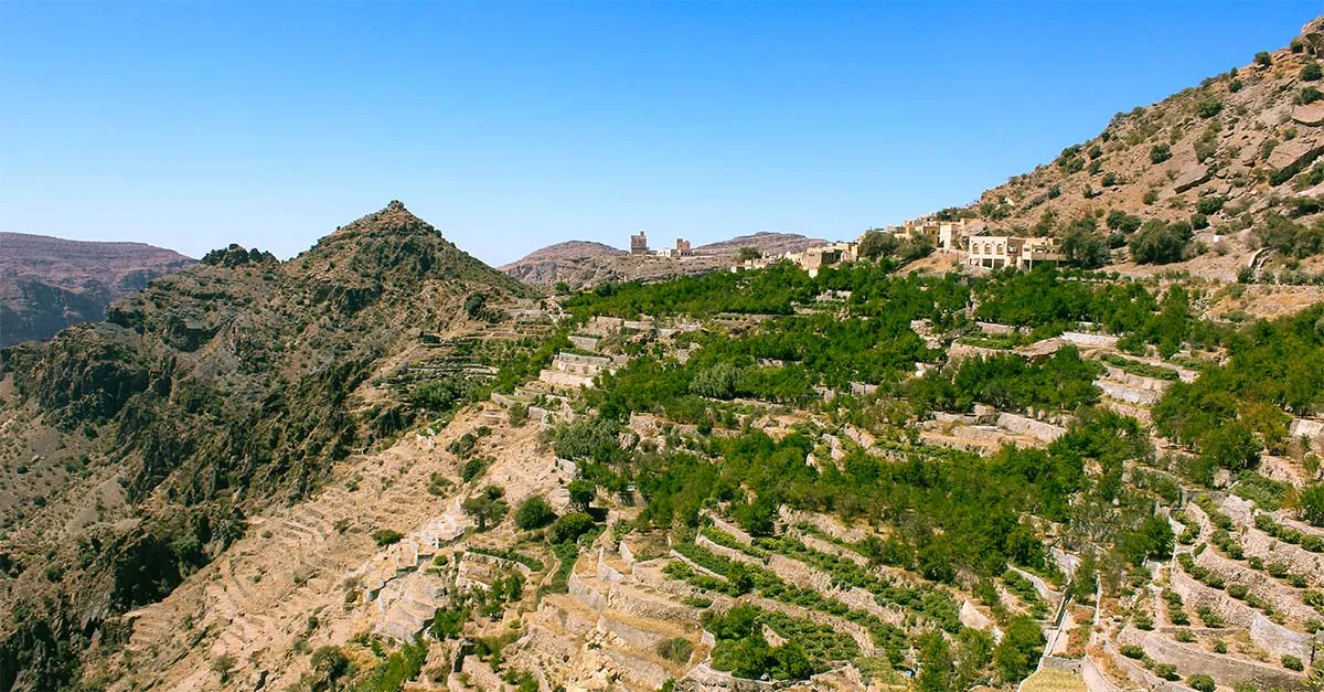 As we follow the rise and fall of the mountain trail, the irrigated ridges of well-nourished gardens drop neatly down into the valley from the brink of Al Aqr. Feeling the effects of the searing sun, I stop to watch white butterflies flutter between flower-laden trees as I make my last ascent up slender, rock-wrought steps.