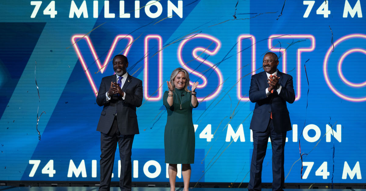 Pictured announcing the 2022 visitor numbers, from left: Terry Prather, senior advisor for Lift Orlando; Casandra Matej, president and chief executive of Visit Orlando; and Orange County Mayor Jerry L. Demings