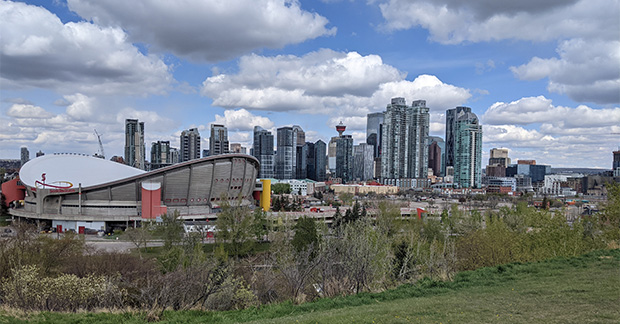 One of Calgary’s big tourist draws is the Calgary Tower. Standing at the top, 160 metres above the city centre, among its skyscrapers, it’s possible to see the city’s fast-growing neighbourhoods in all directions. I squint down and see a train track, where seemingly miles of freight are slowly being pulled between buildings on their journey into the Albertan plains.