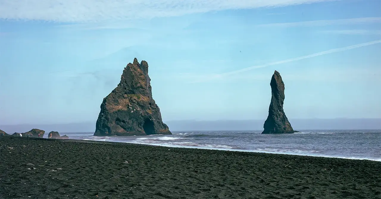 Sheer basalt columns tower over the otherworldly black sand, which I scoop up.