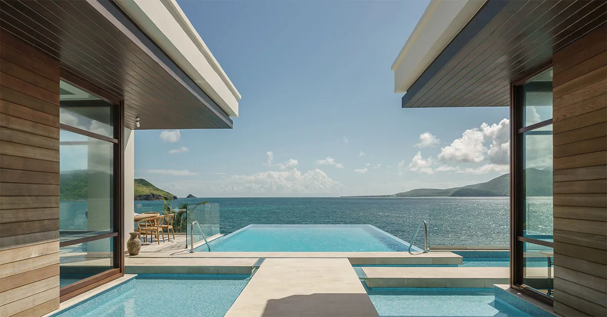 Along with villas that come with private terraces, plunge pools or even rooftop infinity pools, the resort offers panoramic views across to sister island Nevis. The spa delivers treatments inspired by local ingredients, and even the arrival feels considered: guests walk past koi ponds before reaching an open‑air ‘Living Room’ check‑in area that overlooks the sea.