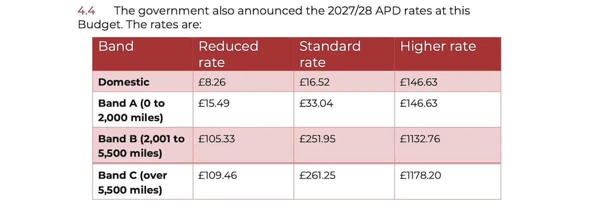 The government announced it will “uprate all rates of Air Passenger Duty in line with RPI [retail price inflation] from 1 April 2027”.