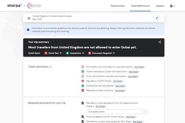 The tool uses a platform developed by automated travel advice specialist Sherpa.com, which aggregates millions of data points from thousands of sources, including governments, airlines, airports, tourism boards, public forums and media outlets across the world.
