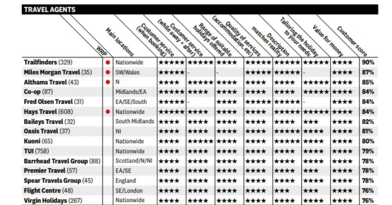 Trailfinders topped the table with a score of 90% followed closely by Miles Morgan Travel at 87% and Althams Travel at 85%.