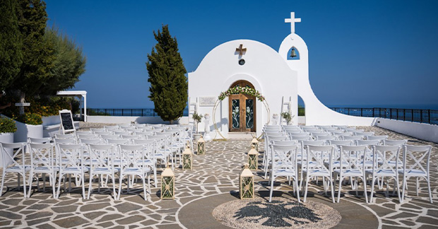 The chapel is family-friendly and the package allows for 25 guests. For couples dreaming of a slightly bigger affair, extra guests can be accommodated for €10 per person. Stunning scenery isn’t in short supply across the rest of the island, including at the Esperides Beach Resort, which has a beach on its doorstep and is peppered with swaying palms and vibrant flowerbeds.