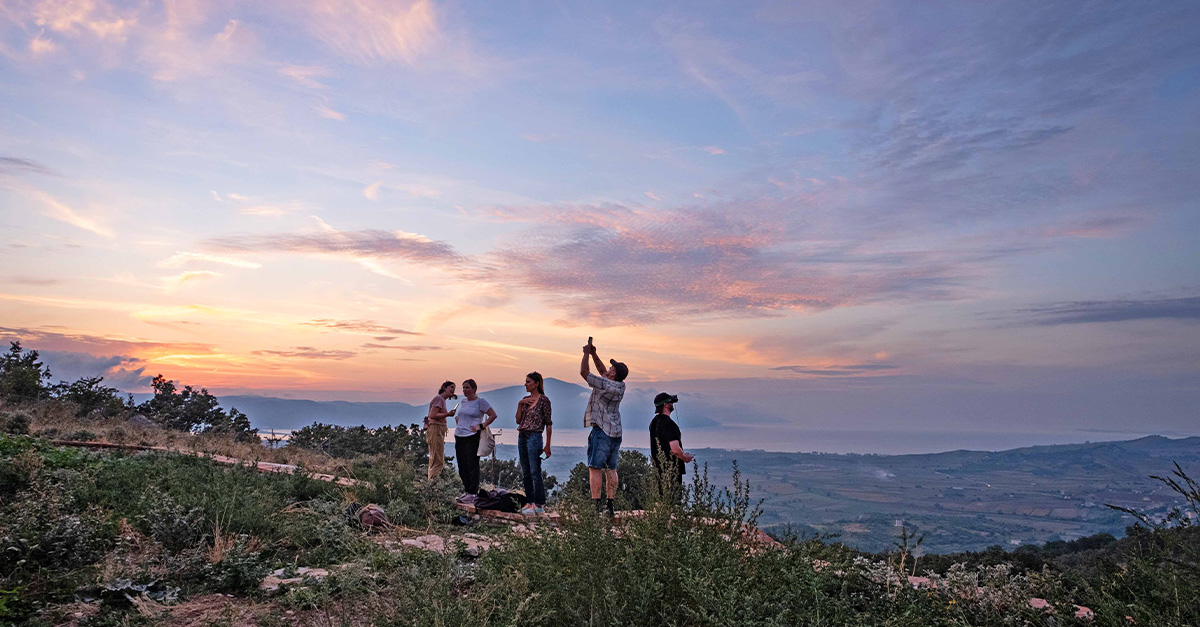 In Tragjas we hike up a mountain at sunset and arrive at a shepherd’s hut, belonging to Sofo and Dhurata, who welcome us with homemade cinnamon-and-honey-infused raki and celebratory sweet treats. As dusk descends, we watch Sofo put his turkeys and goats to bed before he serenades us on his harmonic wooden flute, while Dhurata brings us grilled goat, aubergines, peppers and freshly made cheeses for dinner – plus plenty more homemade raki.