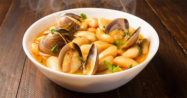 A dizzying variety including lobster, crab, razor clams, tuna, scallops and more make a base for seafood dishes such as fabes con almejas (a clam and bean stew, pictured), mejillones picantes (paprika-spiked mussels) and chipirones afogaos (squid fried with garlic).