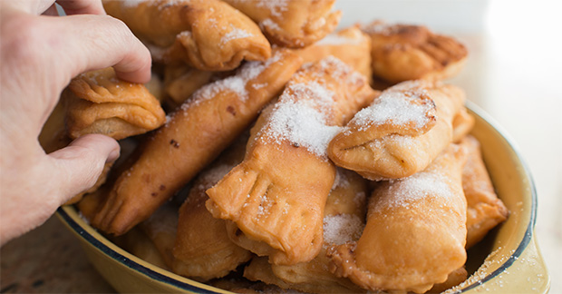 Bakery windows are stuffed with tempting treats such as casadiellas (walnut-stuffed dumplings, pictured), carbayones (glazed almond cream-filled pastries) and frixuelos (sweet crepes), popular during the annual carnival.