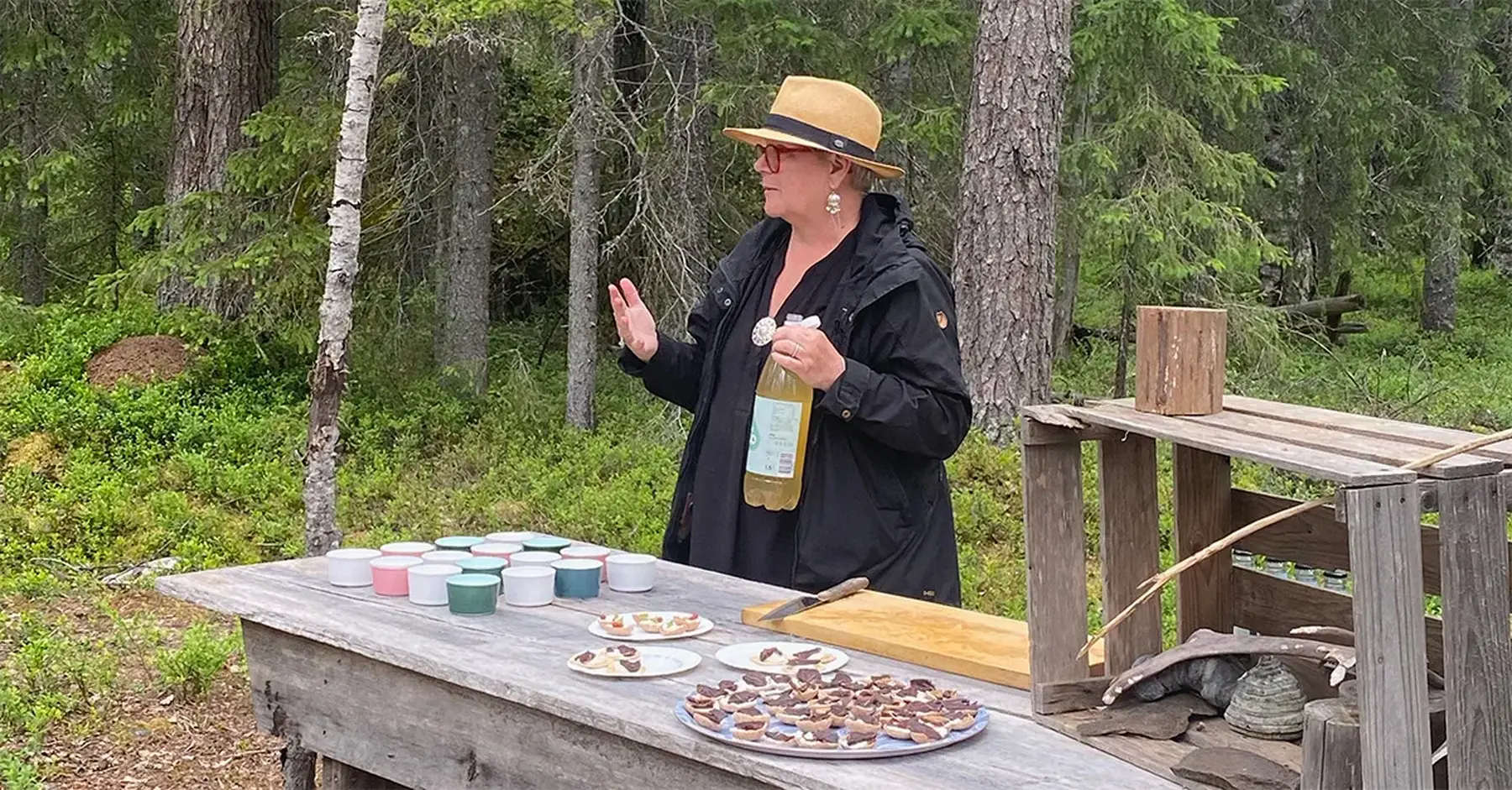 Pia and her husband Henry run experiences to educate visitors on Sámi culture and cuisine, deep in the forest in Övertorneå. We try our hand at foraging, looking diligently at the flora beneath us to find some pretty shoots to decorate our table for lunch as well as garnish our drinks, before sitting down to enjoy some local delicacies.